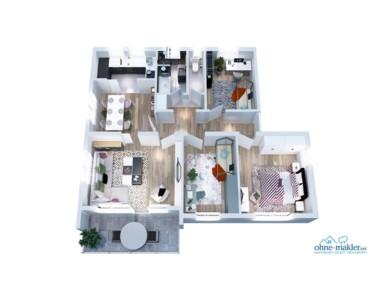 4 1/2-Zimmer-Wohnung, aufgeteilt in ein großes Wohn-/ Esszimmer mit Zugang zum Balkon, eine abgeschlossene Küche, Flur, Elternschlafzimmer, Kinderzimmer 1, Kinderzimmer 2, Tageslichtbad, Gäste-WC, großer, weitestgehend überdachter Balkon. Wohnfläche ca. 96 m².