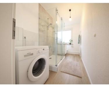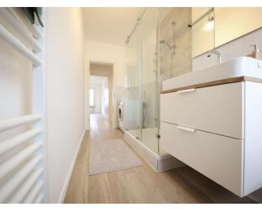 Das modern gestaltete Tageslichtbad ist mit hochwertigen Fliesen, einer zeitgemäßen Duschwanne, einem Handtuchheizkörper sowie einem Waschmaschinenanschluss ausgestattet. Die Küche präsentiert sich ebenfalls modern und bietet ausreichend Platz für einen kleinen Essbereich.