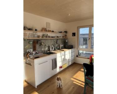 Das Besondere: Wir bauen ein modernes Holzhaus für 11 Parteien, mit hellen, schönen Räumen, Eichenparkett und Fußbodenheizung, das behagliche Wohnatmosphäre mit nachhaltiger Bauweise verbindet.