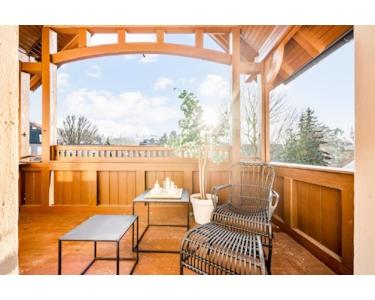 Überdachter Balkon mit Blick auf Bach & Burg
