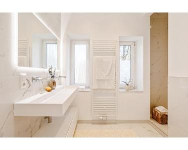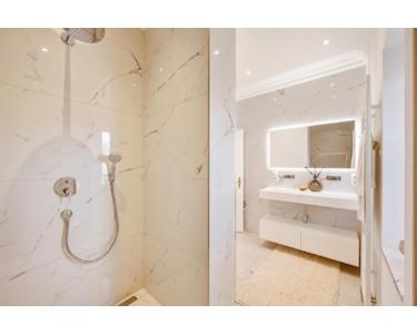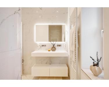 Exklusives Badezimmer mit XXL bodentiefer Dusche, Doppel-Waschbecken, Unterputz-Wandarmaturen, Spiegel mit indirekter Beleuchtung
