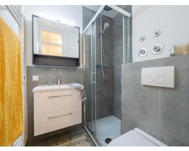 Modernes Bad mit Regendusche und Glasduschkabine, Waschtisch mit zwei Auszügen, dreiteiligem Spiegelschrank, Großer Handtuchheizkörper sowie programmierbare Fußbodenheizung