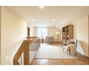 Im Dachgeschoss befindet sich ein großzügiger, offener Bereich mit Arbeits- und Schlafmöglichkeiten – perfekt für Homeoffice, Gäste oder individuelle Wohnideen. Optional lässt sich hier mit geringem Aufwand ein zusätzlicher Raum schaffen, sodass auch Familien mit zwei Kindern ideale Bedingungen vorfinden.