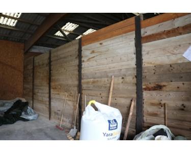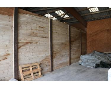 Die Halle ist in einzelne Boxen unterschiedlicher Größe durch Holzbohlen und Holzwände unterteilt.