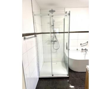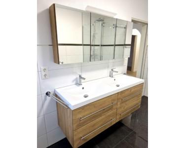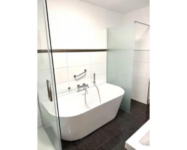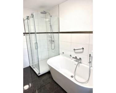 Modernste Ausstattung des Bad´s mit Glas-Regendusche, Badewanne und Doppelwaschbecken mit Unterschrank und großem Spiegelschrank (alles NEU).