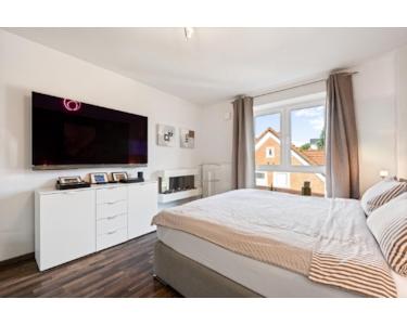 - Schlafzimmer mit bodentiefem Fenster und großem Kleiderschrank