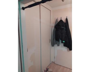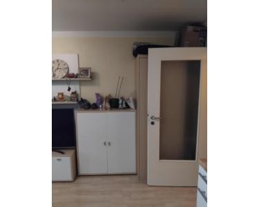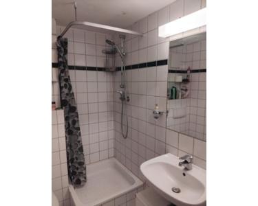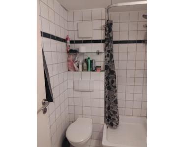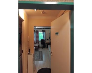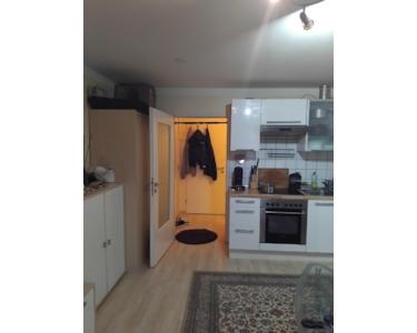 Die freundliche, ruhige Wohnung befindet sich im 1. OG des Hauses. Der Besucher tritt vom Treppenhaus in den Eingang des Hausflurs von dem mehrere Appartements abgehen. Das Appartement selbst betritt man über einen kleinen Vorflur, der mit einem praktischen Einbauschrank versehen ist und von dem links das Duschbad abgeht und geradeaus der Wohn- Schlafbereich mit offener Küche gestaltet ist. Zwei große Fenster geben dem 27 qm großem Raum helles Licht und der Blick schweift ins Grüne.