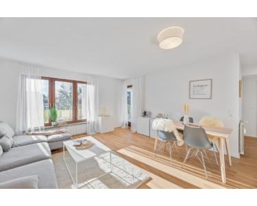 - Helles und großzügiges Wohnzimmer mit großen Fenstern und Zugang zur Terrasse,