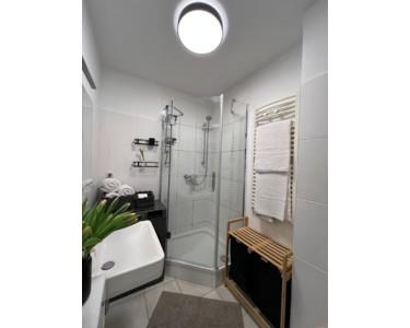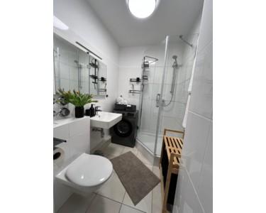 Ausgestattet mit einer Dusche und einer Waschmaschine.