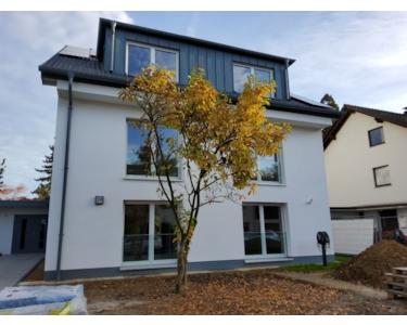 Ein großzügiges Dreifamilienhaus in einer gewachsenen Lage wurde mit höchstem Komfort und höchstem Effizienzhaus-Standard ausgestattet, Sie ziehen als Erste ein. Von der zentralen Diele gelangen Sie in alle Räume. Zwei große Räume mit großen Fenstern können als Schlaf- oder Arbeitsräume genutzt werden. Das Bad ist mit hochwertigen Sanitäranlagen und einer bodengleich gefliesten Dusche ausgestattet. Der großzügige, lichtdurchflutete Wohnbereich ist offen mit der Küche und dem Essbereich verbunden. Eine Küchenplanung mit allen Anschlüssen für eine vollausgestattete Küchenzeile ist vorhanden. Die hochwertigen Parkettböden und die bodentiefen Fenster sorgen für ein modernes und helles Ambiente. Von der weitläufigen Loggia blicken Sie in die Gärten und zum nahen Wald. Über eine Treppe mit Holzstufen gelangen Sie zum ausgebauten Dachstudio. Dort können Sie ein weiteres großes Zimmer nach Ihren Bedürfnissen - privat oder beruflich - nutzen. Ein kleines WC ist dort ebenfalls vorhanden.