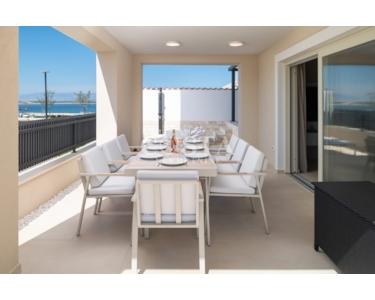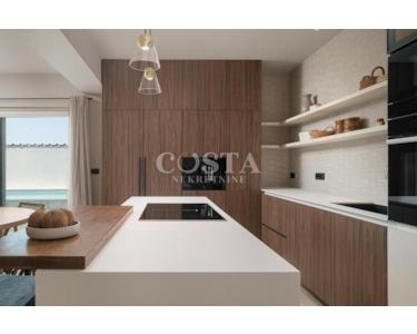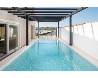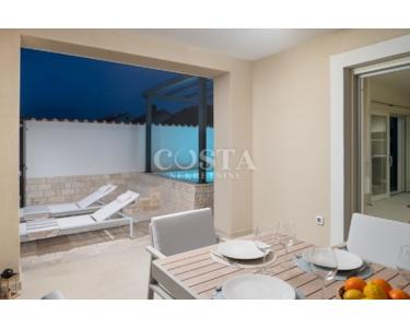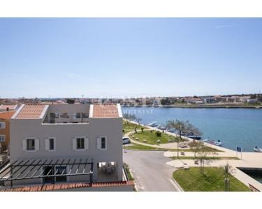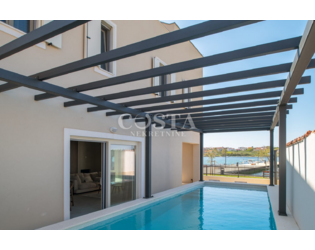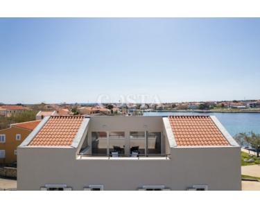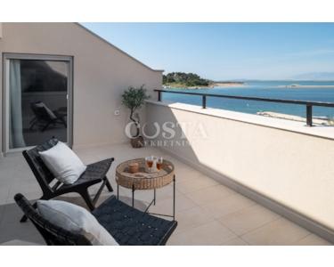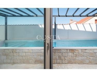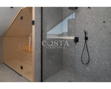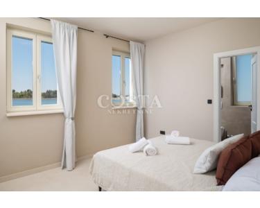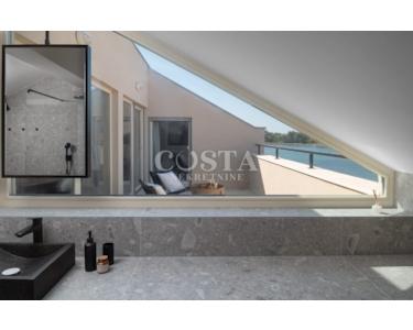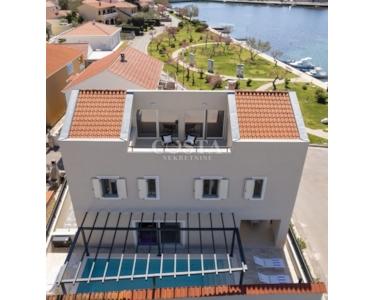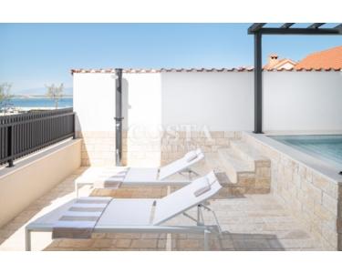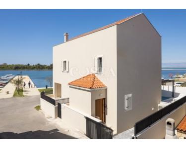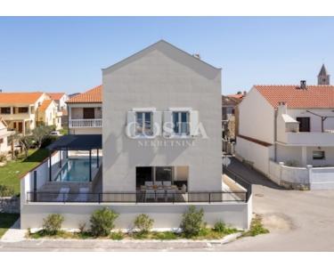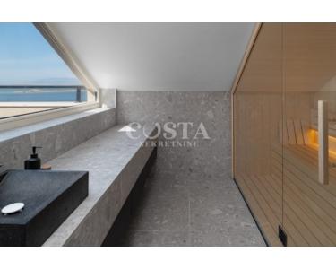 Diese luxuriöse Villa in Nin steht in bester Lage direkt am Meer zum Verkauf. Die Villa mit einer Wohnfläche von 167 m² befindet sich auf einem 214 m² großen Grundstück. Sie besteht aus Erdgeschoss, Obergeschoss und Dachgeschoss, und jede Etage bietet einen atemberaubenden Meerblick. Im Erdgeschoss befinden sich eine offene Küche mit Essbereich, ein Wohnzimmer mit Zugang zu einer Terrasse mit einem 25 m² großen, beheizten Pool, ein Abstellraum und ein Gäste-WC. Das Obergeschoss verfügt über drei Schlafzimmer mit jeweils eigenem Bad. Im Dachgeschoss befinden sich ein weiteres Schlafzimmer, ein Wellnessbereich mit Sauna, ein Badezimmer und eine 15,10 m² große, unüberdachte Terrasse. Private Parkplätze stehen auf dem Gartengrundstück zur Verfügung. Das Anwesen ist vollklimatisiert und verfügt über eine Fußbodenheizung mit Wärmepumpe.
