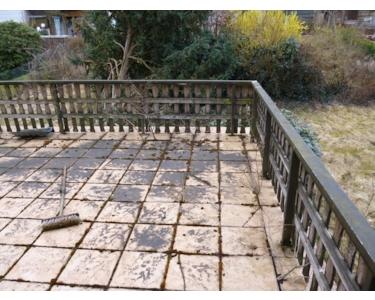 In der Diele der Erweiterung ist im Bereich hinter der Hauseingangstür ein deutlicher Wasserschaden an der Abkastung zu erkennen. Weitere Feuchtigkeitseinträge zeichnen sich im Bereich des eingeschossigen Wohnzimmer/Wintergarten ab. Zusätzlich weist dieser außen Risse und Abplatzungen an der Fassade und der Dachkante auf, z. T. liegt Bewehrung frei.
