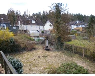 Das trapezförmige Verkaufsgrundstück mit einer mittleren Tiefe von rd. 30 m ist im vorderen (nördlichen) Bereich mit dem Wohnhaus bebaut, der Garten mit südlicher Ausrichtung befindet sich dahinter (leichte Hanglage => von der Straßenseite her ansteigend ).