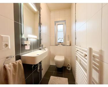 Willkommen in Ihrem privaten Rückzugsort – dem Badezimmer, das durch seine zeitgemäße Gestaltung und hochwertige Ausstattung besticht. Die große, ebenerdige Dusche bildet den Mittelpunkt dieses Raums und verspricht ein luxuriöses Duscherlebnis. Der Komfort wird durch den Handtuchwärmekörper erhöht, der nicht nur für wohlige Wärme sorgt, sondern auch die Handtücher griffbereit hält. Der Badezimmerunterschrank mit integriertem Handwaschbecken vereint Funktionalität und Ästhetik. Die eleganten Oberflächen und die klaren Linien des Unterschranks schaffen nicht nur Stauraum für Ihre persönlichen Pflegeprodukte, sondern verleihen dem Raum auch eine moderne Note. Ein moderner Spiegelschrank bietet nicht nur zusätzlichen Stauraum, sondern setzt auch ein stilvolles Statement. Mit integrierter Beleuchtung schafft er eine angenehme Atmosphäre und erleichtert die tägliche Pflege.