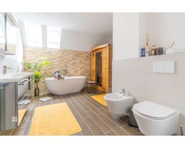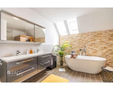 Im Obergeschoss erwarten Sie weitere durchdacht geschnittene Räume. Das großzügige Hauptschlafzimmer bietet direkten Zugang zu einem Balkon mit Blick in den idyllischen Innenhof. Zwei weitere Zimmer lassen sich flexibel als Kinder-, Arbeits- oder Ankleidezimmer nutzen. Das hochwertig ausgestattete Badezimmer überzeugt mit einer freistehenden Badewanne, modernen Armaturen und einer hauseigenen Sauna – ein Ort der Erholung und Entspannung.