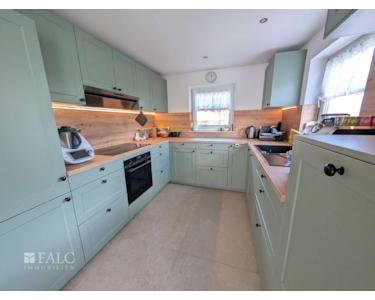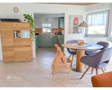 Im 1. Obergeschoss befindet sich der gemütliche Wohn- und Essbereich mit einem warmen Kachelofen von 2023, der für eine behagliche Atmosphäre sorgt. Die moderne Einbauküche, erst 2025 eingebaut, bietet viel Platz und Komfort für kulinarische Kreationen.