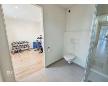 Im Erdgeschoss erwarten Sie ein helles Büro sowie ein Fitnessraum mit Dusche und WC. Optional lässt sich hier auch eine Sauna integrieren – ideal für Wellnessliebhaber. Ein weiteres Highlight ist der kühle Keller mit traditionellem Ziegelstein-Boden, der sich hervorragend zur Lagerung von Lebensmitteln oder Wein eignet.