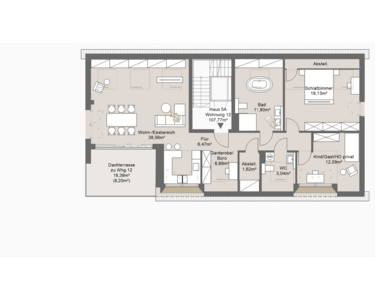 Die Penthouse-Wohnung hat eine tolle Dachterrasse mit tollem Ausblick, exklusive Badausstattung, u.a. eine freistehende Badewanne und ein zusätzliches Gäste-WC