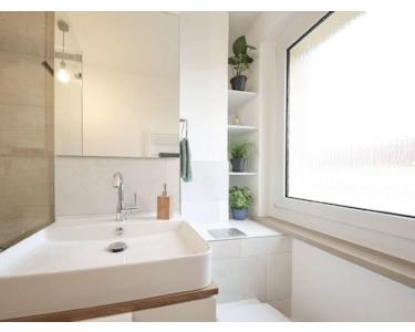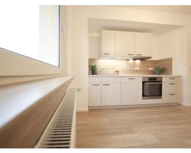 Das modern gestaltete Tageslichtbad ist mit hochwertigen Fliesen, einer zeitgemäßen Duschwanne, einem Handtuchheizkörper sowie einem Waschmaschinenanschluss ausgestattet. Die Küche präsentiert sich ebenfalls modern und bietet ausreichend Platz für einen kleinen Essbereich.