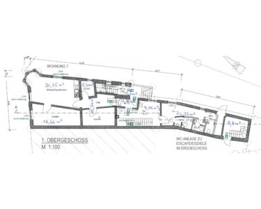 1.OG: Flur, 2 Lager + 3 WC ( für Eisdiele)