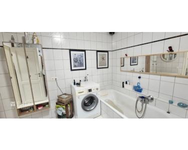 Das Badezimmer ist funktional gestaltet und mit einer Badewanne sowie einer separaten Dusche ausgestattet. Die hellen Fliesen verleihen dem Raum eine freundliche Atmosphäre.