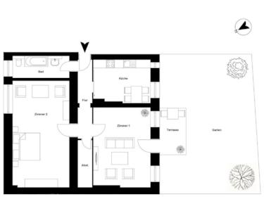 Die Wohnung ist derzeit als großzügige 2-Zimmer-Wohnung gestaltet und verfügt über ein Wohnzimmer, ein Schlafzimmer, eine Küche, ein Badezimmer, eine Abstellkammer sowie den Garten. (Siehe Grundriss und Fotos.)