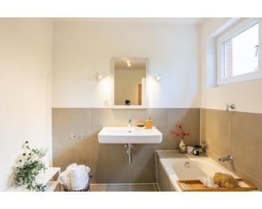 Die hellen Tageslichtbäder sind praktisch gestaltet und runden das stimmige Raumkonzept der Wohnungen ab.