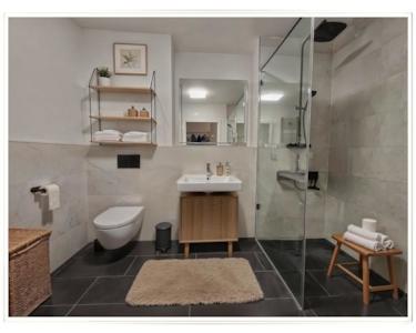 Das Badezimmer hat eine exklusive Sanitärausstattung (z.B. große Walk-in-Dusche), in der nebenan liegenden Kammer/Hauswirtschaftsraum haben Waschmaschine und Trockner ihren Platz.