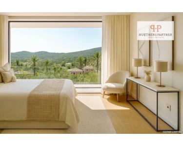 Im Inneren entstehen fünf großzügige Schlafzimmer mit Bad en suite, alle mit privater Terrasse und spektakulärer Aussicht. Das Erdgeschoss öffnet sich zu einem weitläufigen, offenen Wohnbereich mit direkter Verbindung zu einer modernen italienischen Küche von „Cucine“, ausgestattet mit hochwertigen Gaggenau-Geräten inklusive Weinkühlschrank. Zusätzlich befindet sich auf dieser Ebene ein multifunktionaler Raum, der als weiteres Schlafzimmer, Heimkino, Büro oder Freizeitraum genutzt werden kann, sowie ein eigenes Bad und ein Gäste-WC. Die überdachten und offenen Terrassen führen zum 40 m² großen Pool mit Salzwasseranlage – ideal, um das mediterrane Klima zu genießen.