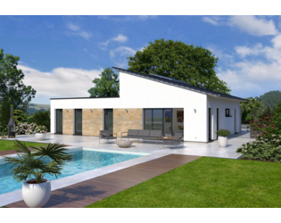 Das extravagante Bungalow Fertighaus mit einer Kombination aus Pult- und Flachdach überzeugt nicht nur in der Architektur, es punktet auch mit einem ausgeklügelten Grundriss. Der Bungalow-Entwurf ist für Singles, Paare oder eine Kleinfamilie gleichermaßen geeignet. Der großzügige Wohn-/Ess-Bereich ist auf 55,8 m² mit der Küchenplanung offen übereck angelegt. Eine geräumige Diele ist dem Wohnbereich vorgelagert. Sie kann auf Wunsch mit einer Glaswand ausgestattet werden, die viel Licht und Transparenz in die Gestaltung bringt. Flexibilität bietet ein Zusatzraum, der als Kinder-, Gäste-, Hobbyzimmer oder als Büro genutzt werden kann. Ein Schlafzimmer mit viel Stellfläche, ein Duschbad, ein Gäste-WC und ein Haustechnikraum komplettieren das Raumangebot des extravaganten Bungalow-Fertighauses.