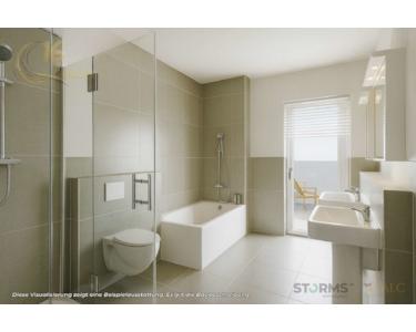 Das Badezimmer ist in der Planung mit einer Badewanne sowie einer separaten Dusche vorgesehen. Die Sanitärausstattung wird modern und funktional ausgeführt.