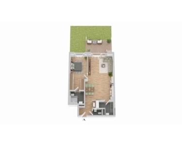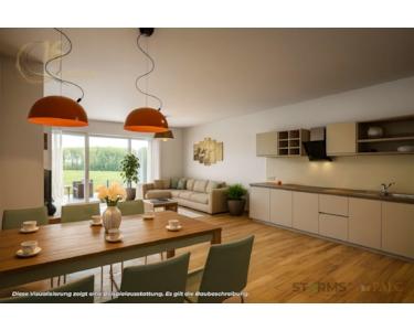 Die Wohnung verfügt über einen offen geplanten Wohn-/Essbereich mit Küche, der als zentraler Aufenthaltsbereich konzipiert ist. Das Schlafzimmer ist separat gelegen. Zusätzlich ist ein Hauswirtschaftsraum vorgesehen. Ein weiteres Komfortmerkmal ist das separate Gäste-WC, das den Alltag – insbesondere bei Besuch – deutlich erleichtert.