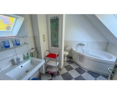 eigener Zugang über ein eigenes Treppenhaus mit schöner Marmortreppe, Wohn-/Esszimmer mit Küchenzeile, Schlafzimmer, Gästezimmer, Duschbad, Wannenbad, Flur