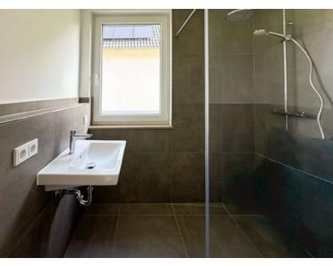 Beim Betreten des Hauses empfängt Sie ein zentraler Flur, von dem aus alle Räume im Erdgeschoss erreichbar sind. Auf der linken Seite befindet sich ein lichtdurchflutetes Zimmer, das sich ideal als Arbeits-, Gäste- oder Hobbyzimmer eignet. Rechtsseitig liegt der Hauswirtschaftsraum mit Anschluss für Waschmaschine und Trockner sowie der Haustechnik. Direkt daneben befindet sich ein modernes Tageslicht-Gästebad mit Dusche.