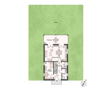 Geradezu öffnet sich der großzügige Wohn-, Ess- und Kochbereich mit einer Fläche von rund 38 m² – der ideale Ort zum Wohlfühlen und Verweilen. Die offene Wohnküche schafft eine harmonische Verbindung zwischen Kochen, Essen und Wohnen und führt direkt auf die sonnige Terrasse mit Blick in den gepflegten Garten.