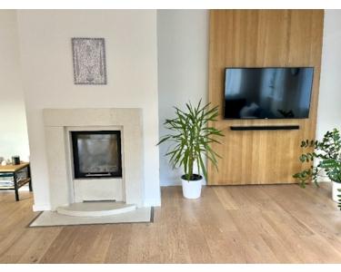 großzügigen Wohnbereich führt. Dieser beeindruckt mit bodentiefen Fenstern, einem gemütlichen Kamin und dem Zugang zur Terrasse, sowie in den liebevoll angelegten Garten.