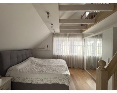 Im Obergeschoss erwarten Sie ein großzügiges Elternschlafzimmer mit angrenzender Ankleide sowie ein stilvolles Familien-Badezimmer mit Badewanne, Dusche, Doppelwaschtisch, Bidet und WC.