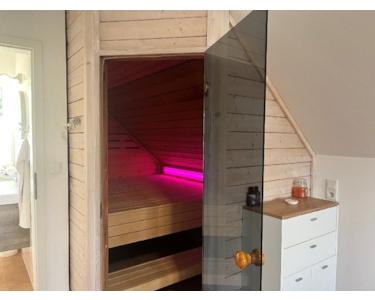 darüberliegenden Dachraum, der als Wellnessbereich mit Sauna, Dusche, WC und Waschbecken ausgebaut wurde.