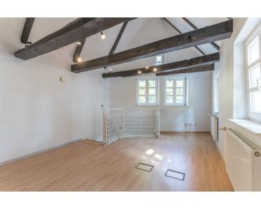 Eine interne Treppe führt ins Obergeschoss, das mit zwei weiteren Räumen aufwartet. Besonders hervorzuheben ist der vordere Raum: Hier sorgen freiliegende Dachbalken und eine bis in den First offene Decke für ein großzügiges Raumgefühl und eine besondere Ausstrahlung. Klassische Sprossenfenster in beiden Etagen unterstreichen den historischen Charakter und sorgen zudem für ausreichend Tageslicht.