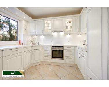 Die helle Nolte Marken-Küche im charmanten Landhausstil überzeugt mit viel Stauraum und stilvollen, beleuchteten Vitrinen. Der Blick in den angrenzenden grünen Wald macht das Kochen hier zu einem besonderen Genuss – ein Ort, an dem man gerne verweilt und kreativ wird. Auf dieser Ebene rundet ein ebenfalls 2012 neugestaltetes Gäste-WC das Raumangebot ab.