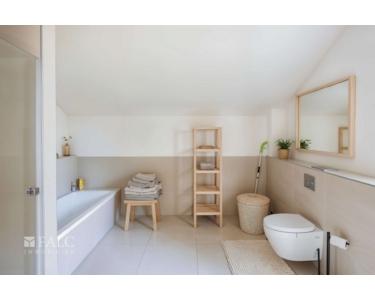 Das Badezimmer im Obergeschoss ist modern gestaltet und verfügt über eine Badewanne sowie eine separate Dusche, die den täglichen Komfort erhöhen.