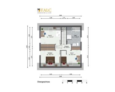 Über eine stilvolle Treppe gelangen Sie in das Obergeschoss, wo sich drei Schlafzimmer befinden. Das Hauptschlafzimmer mit 16,21 m² bietet einen ruhigen Rückzugsort, während die beiden Kinderzimmer mit 15,01 m² und 17,42 m² viel Platz zum Spielen und Lernen bieten.