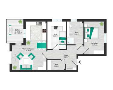 Der offen gestaltete Wohn-, Ess- und Küchenbereich bildet den Mittelpunkt der Wohnung. Große Fensterflächen sorgen für eine helle, freundliche Stimmung und führen auf den Balkon. Neben dem Wohnbereich stehen ein Schlafzimmer sowie ein weiteres Zimmer zur Verfügung, das flexibel als Kinder-, Gäste- oder Homeoffice-Zimmer genutzt werden kann. Der klar strukturierte Grundriss wird durch eine zentral gelegene Diele, einen separaten Abstellraum und kurze Wege optimal ergänzt.