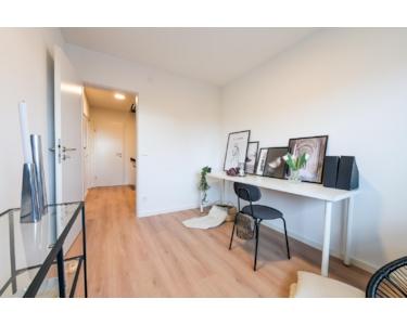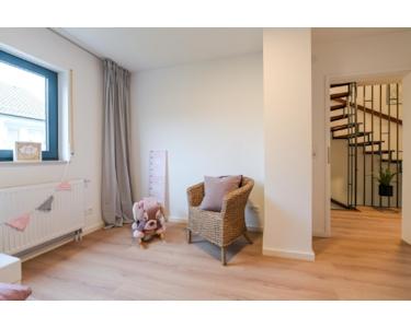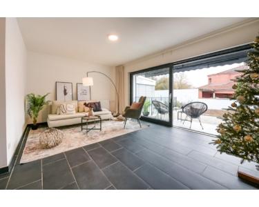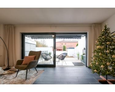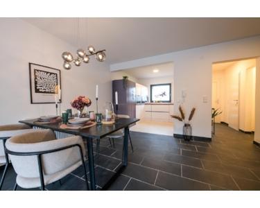 Im Erdgeschoss befindet sich der helle Wohnbereich mit offener Küche. Große Fenster sorgen für eine angenehme Wohnatmosphäre. Von hier gelangen Sie direkt auf die Terrasse – ideal für entspannte Stunden im Freien. Ein Gäste-WC ergänzt diese Ebene.