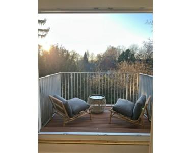Die helle Ausleuchtung ergibt sich neben dem Dachfenster auch durch die große Gaube, von der aus man auf den Balkon gelangt. Der nach Südwesten ausgerichtete Balkon liegt rückseitig und somit ruhig zum Garten. Mit einer Fläche von knapp 4 m² bietet er Platz für einen kleinen Tisch und Stühle – der Blick kann hier ins Grüne schweifen.