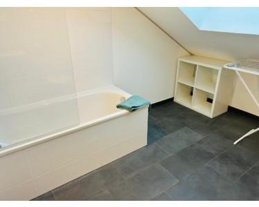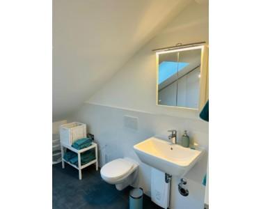 Vom Wohnzimmer aus gelangt man durch eine Tür in das ansprechende Badezimmer (ca. 5,7 m²) mit Badewanne, WC, Waschbecken und Spiegelschrank. Im Badezimmer sorgen neben dem Dachfenster auch zwei normale Fenster für eine helle und freundliche Atmosphäre.