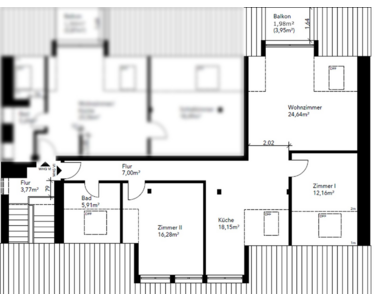 Insgesamt wirkt die Wohnung durch die nicht anrechenbaren Teile der Dachschrägen größer, als es die Quadratmeterangabe vermuten lässt.