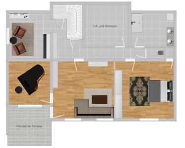 Im Dachgeschoss befindet sich eine ca. 59 qm große Wohnung. Diese verfügt über ein großes Wohn-/Esszimmer, ein Schlafzimmer, eine Küche und ein Tageslicht-Duschbad. Die Wohnung befindet sich in einem renovierungsbedürftigen Zustand und ist derzeit für monatlich 600 € vermietet.