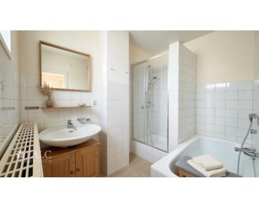 -Der Altbau verfügt über drei gut geschnittene Zimmer, eine Küche, ein Badezimmer sowie ein separates Gäste-WC. Ergänzt wird dieser Bereich durch einen Keller mit direktem Zugang zum Garten. Im Obergeschoss befinden sich zwei Schlafzimmer sowie ein ausbaufähiger Dachboden, der weiteres Potenzial für individuellen Wohnraum bietet.