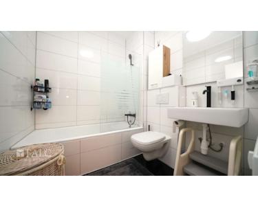 Das Badezimmer ist klassisch weiß gefliest und verfügt über ein WC, eine Badewanne mit Glasschutz sowie einen komfortablen Waschbeckenbereich mit Badeschrank, der praktischen Stauraum bietet. Ideal für eine angenehme Morgen- und Abendroutine.